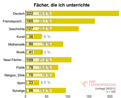 An der Umfrage (11.-22. September 2015) beteiligten sich 509 Lehrer/innen. Als letztes baten wir um Angabe der unterrichteten Fächer (Mehrfachauswahl), woraus sich diese Verteilung ergibt: