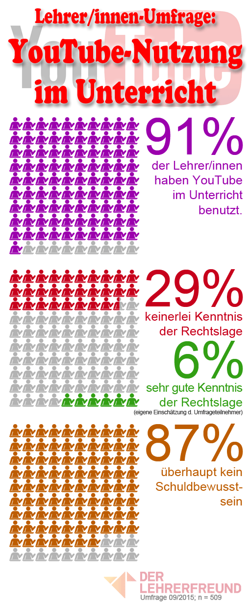YouTube wird von Lehrer/innen als überaus sinnvolles Hilfsmittel eingestuft, die meisten Lehrer/innen haben jedoch wenig Ahnung von der rechtlichen Situation. Schuldig fühlen sich die wenigsten - für viele ist der gute Zweck (guter Unterricht mit guten Medien) wichtiger als das Einhalten der Gesetze.
