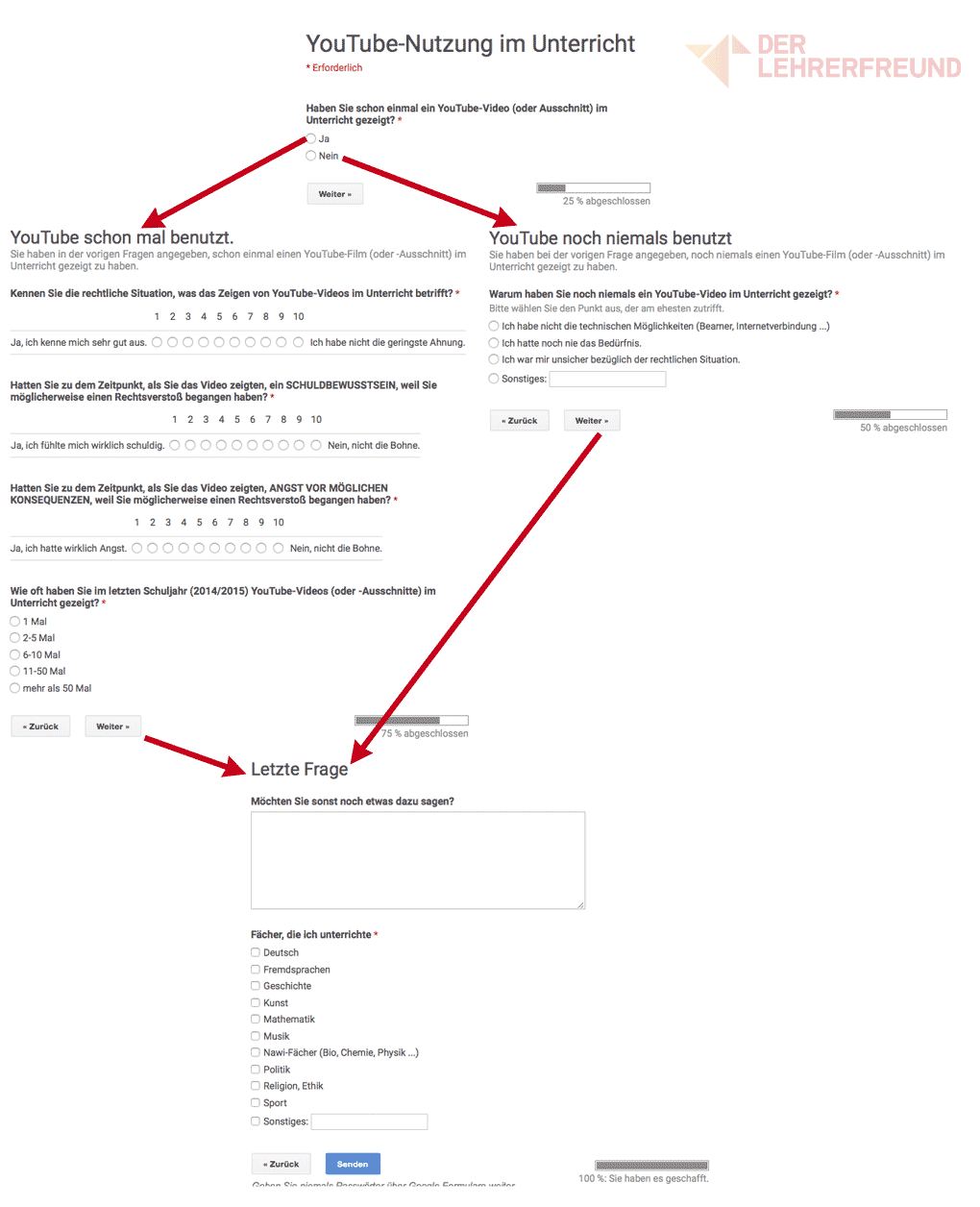 Basierend auf der Antwort auf diese erste Frage verzweigte sich der Fragebogen. Wer die Frage mit "Nein" beantwortete, wurde nach den Gründen dafür befragt (n = 47), die anderen (n = 462) erhielten Fragen zur Rechtssicherheit, Schuldbewusstsein, Angst vor rechtlichen Konsequenzen und zur Häufigkeit der YouTube-Nutzung im Unterricht. Zum Schluss erhielten alle die Möglichkeit zur Freitexteingabe und wurden nach ihren Fächern gefragt.