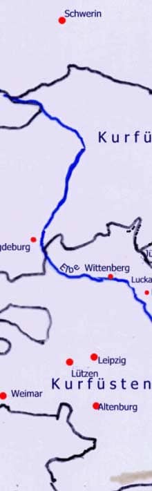 Ausschnitt: Karte mit den wesentlichen Handlungsorten in Kleists Novelle 'Michael Kohlhaas'Michael Breddin hat eine wirklich imposante Sammlung an Unterrichtsmateralien zu Michael Kohlhaas zusammengestellt. Dass die es sich dabei eher um Unterrichtsbausteine als um eine in sich geschlossene Unterrichtseinheit handelt, ist unwesentlich, da das meiste Material schon im Deutschunterricht erprobt worden ist und somit direkt verwendet werden kann. Alle Dateien liegen sowohl als pdf- wie auch als Word-Dokument vor, so dass man als Lehrperson einfach Änderungen vornehmen kann.
