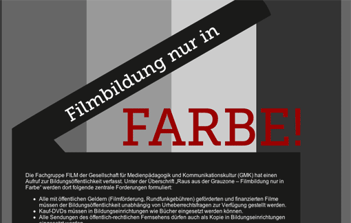 Auf der Website filmbildung-nur-in-farbe.de findet eine Unterschriftenaktion statt, an der sich die meisten Lehrer/innen mit einem gesunden Urheberrechtsbewusstsein beteiligen wollen. Der Aufruf „Raus aus der Grauzone – Filmbildung nur in Farbe“ wurde von der Fachgruppe FILM der GMK (Gesellschaft für Medienpädagogik und Kommunikationskultur) verfasst.