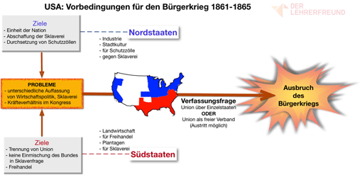 Wenn Sie dieses Schaubild im Geschichtsunterricht als Tafelbild entwickeln, können Sie es bei Bedarf etwas vereinfachen (z.B. weglassen der Strukturmerkmale der Nord-/Südstaaten) - Ziele, Probleme, Folgen.