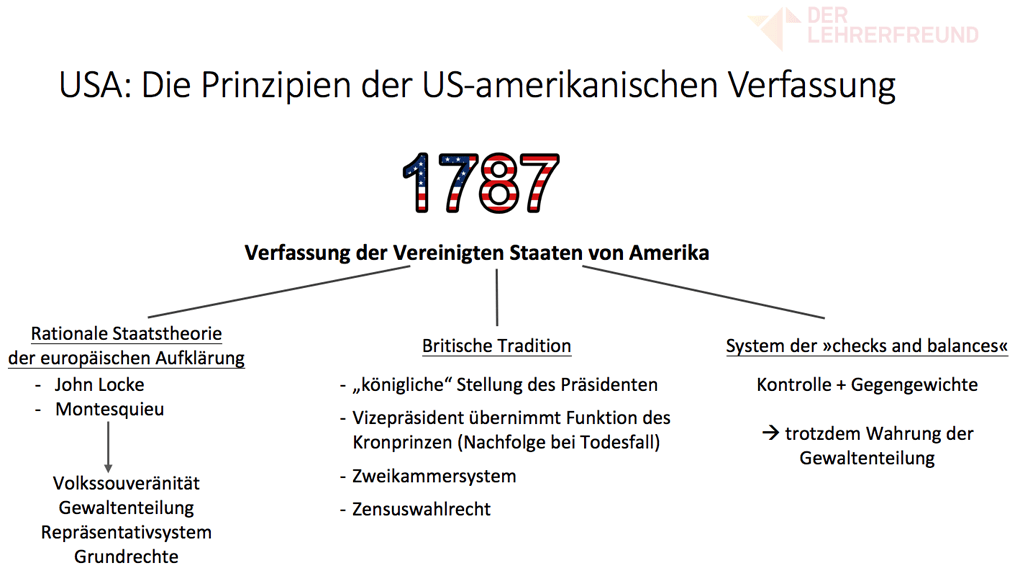 Auf dem Tafelbild dargestellt sind die Prinzipien der US-amerikanischen Verfassung von 1787, die von drei wesentlichen Einflussfaktoren bestimmt wird:
