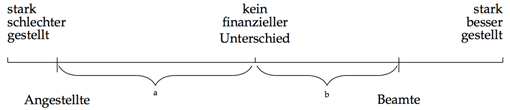 Die Angestellten fühlen sich demnach finanziell stark benachteiligt (Mittelwert = 1,59), wohingegen die Beamten sich lediglich finanziell bessergestellt fühlen (Mittelwert = 5,73). Die angestellten Lehrer befinden sich mit ihrer Einschätzung weiter von der neutralen Antwort mit dem Wert 4 entfernt als die verbeamteten Kollegen (nachzuvollziehen durch einen Vergleich der Entfernung der Angestellten a und derjenigen der Beamten b).