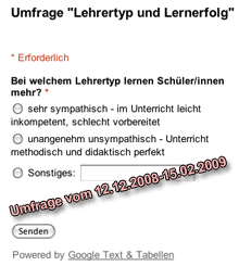Hier gaben 246 Lehrpersonen im Zeitraum vom 12.12.2008 bis zum 15.02.2009 Ihre Meinung ab (Formular siehe rechts).