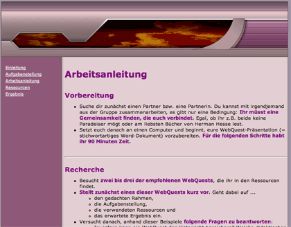 Ihr könnt an dem WebQuest einerseits sehen, welche Teile diese interessante eLearning-Methode umfassen soll und wie sie funktioniert und werdet sozusagen nebenbei zu interessanten theoretischen und praktischen Seiten geschickt, die sich mit WebQuests befassen.