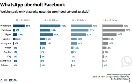 Die BITKOM-Studie wird deutlicher: Hier liegt WhatsApp bei den Kindern und Jugendlichen bis 16 Jahren deutlich vor Facebook: