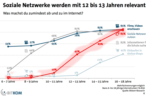 Die meisten Ergebnisse sind nicht überraschend: Schon ab einem Alter von 10 Jahren sind fast alle Kinder online, 20 Prozent der 6- bis 7-Jährigen nutzen Smartphones. 85 Prozent der 12- bis 13-Jährigen nutzen (= "haben"?) ein Smartphone. Das wussten die meisten Lehrer/innen schon vor Veröffentlichung der Studie.
