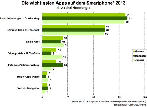 Erstaunlich ist hier der große Vorsprung der Instant-Messaging-Tools. Zum Zeitpunkt der JIM-Befragungen war die Facebook-App immerhin schon seit mehr als einem Jahr in den App-Stores erhältlich.