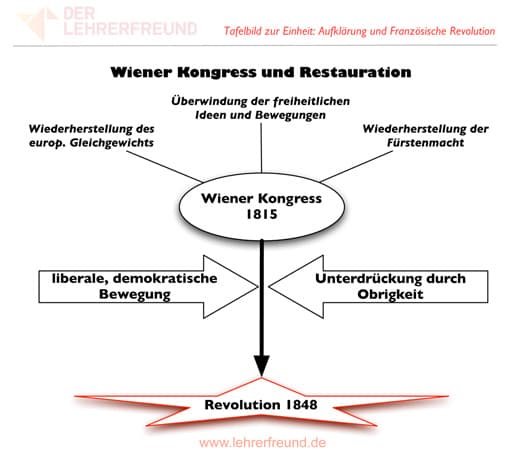 Das Tafelbild kann zum Abschluss einer Unterrichtseinheit “Aufklärung und Französische Revolution” bzw. “Restauration, Vormärz und Revolution 1848” erarbeitet werden. Sinnvoll ist alternativ eine Darstellung vorab (z.B. nach Behandlung des Wiener Kongresses), auf die man während des weiteren Unterrichtsganges verweisen kann.