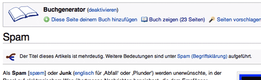 Anschließend zeigt sich über jedem Artikel der "Buchgenerator". Hier kann man den gerade aufgerufenen Artikel dem geplanten Buch hinzufügen, das Buch ansehen oder Seiten vorschlagen.