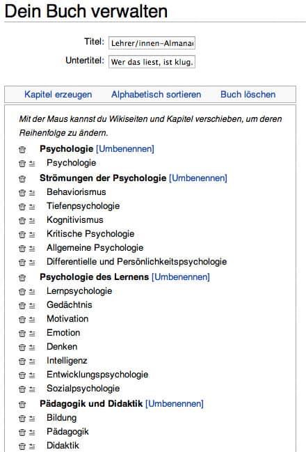 Nach Klick auf "Buch zeigen" kommt man zur Verwaltung des Buchs. Hier kann man den Titel und Untertitel des E-Books festlegen, Kapitel einfügen und die einzelnen Artikel/Kapitel ordnen. Beachten Sie bitte, dass die hier vorgestellten Beispiele in wenigen Minuten erzeugt wurden.