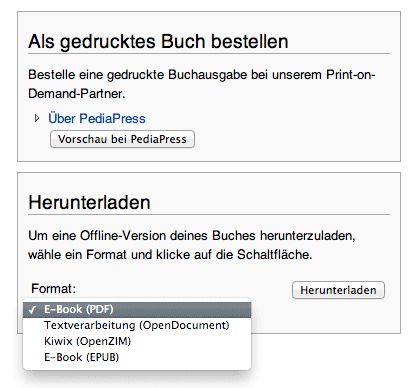 Nachdem man sich nun mehr oder weniger reflektiert seine Artikel zusammengeklickt hat, wird es interessant: Das Buch kann entweder in verschiedenen Formaten heruntergeladen werden: als PDF, als EPUB (E-Book-Format), zum Bearbeiten im ODF (als .odt für Open Office & Co) oder als Wiki-Sicherungsdatei im Kiwix/ZIM-Format.