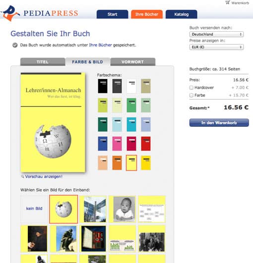 Sein Buch kann man auch direkt beim Wikipedia-Print-on-Demand-Dienst PediaPress drucken lassen. Der Vorgang ist denkbar einfach, man wähle ein Coverbild (Vorschläge für Bilder in Anlehnung an den Inhalt), Titel, Umschlagfarbe, schreibe ein Vorwort und fertig. Die Preise sind moderat, für einen 741-Seiten-Moloch legt man 33 Euro hin (zzgl. 6 Euro Versand). Für 7 Euro Aufpreis gibt es das Ganze als Hardcover, Farbdruck kostet saftige 37 Euro dazu (was bei 741 Seiten durchaus nicht übertrieben ist). Die Bücher werden innerhalb von 2-3 Werktagen erstellt (Farbe dauert länger).