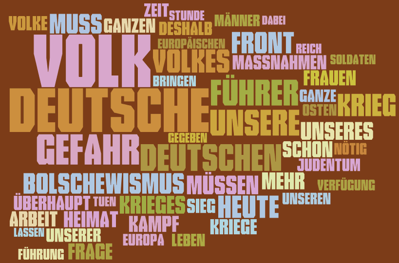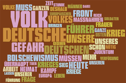 Sehen Sie sich die folgende Wort-Wolke von Goebbels’ Sportpalastrede (Volltext) an - auf einen Blick springen einen die bekannten Wort- und Denkhülsen des Nationalsozialismus an (Volk, Krieg, Gefahr, Bolschewismus, Front, Maßnahmen, Führer ...).
