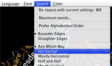 1. Im Menü Layout können Sie die Schriftausrichtung ändern (der besten Lesbarkeit wegen unbedingt empfehlenswert: “horizontal”); die Option “maximum words” legt fest, wie viele Wörter insgesamt angezeigt werden. Die Originaleinstellung 150 ist i.d.R. zu üppig, da man die kleinen Wörter schlecht lesen kann. Wählen Sie einen Wert zwischen 20 und 80.