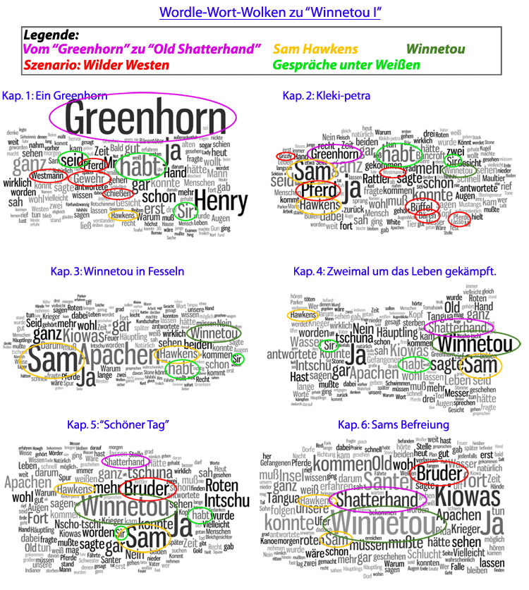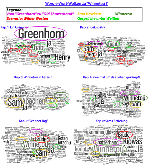 Karl May neigt bekanntermaßen zu epischer Breite - Winnetou I ist ein Schmöker, dessen sechs Kapitel sich auf geschätzt >400 Seiten verteilen (Volltext). Betrachten Sie die folgenden Wort-Wolken zu den einzelnen Kapiteln: