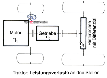 Jede Maschine muss für unvermeidliche Verluste (Reibung in bewegten Teilen, Wärmeverluste usw.) Leistung aufwenden, die die Gesamtleistung schmälern. Wenn etwa ein Fahrzeug mit Verbrennungsmotoren-Antrieb an der Schwungscheibe 100 kW abgibt, dann geht im Schaltgetriebe, im Differenzial und im Achsgetriebe (Schemabild) unweigerlich ein Teil davon verloren. Insgesamt können das gut 20 kW sein. Den Hinterrädern stehen von den 100-Motor-kW also nur noch 80 kW zur Verfügung.