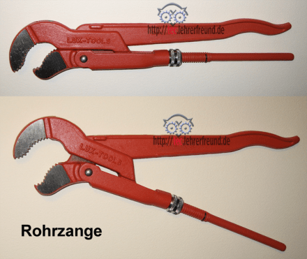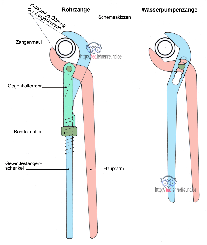 Bei der einfachen Wasserpumpenzange drehen sich beide Zangenschenkel um eine gemeinsame Achse. Diese Konstruktion wurde bei der Rohrzange erweitert: Der Gewindestangenarm ist im Gegenhalterrohr frei verschiebbar. Die Rändelmutter begrenzt den Verschiebeweg und damit die Maulöffnung. Beim Umklammern einer Armatur stützt sich der Gewindestangenarm mit der Rändelmutter am unteren Ende des Gegenhalterrohrs ab. Die Abstützkraft ist die Reaktionskraft auf die Maulkraft F3. Je stärker der Hauptarm gedrückt wird, desto größer ist die Maulkraft und damit die Druckkraft der Rändelmutter.