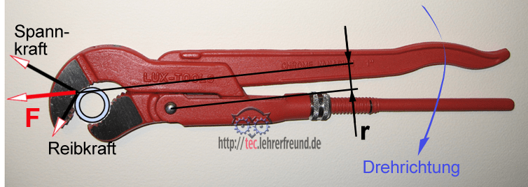 Selbstverstärkung: Die Kraft F ist die Resultierende aus Reibkraft und Spannkraft. F liegt rechts vom Drehpunkt. Das Drehmoment F x r - es schließt das Maul - ist der Grund für die selbstverstärkende Wirkung der Rohrzange. Bei der Wassepumpenzange wirken die Kräfte so, dass sie das Maul öffnen.