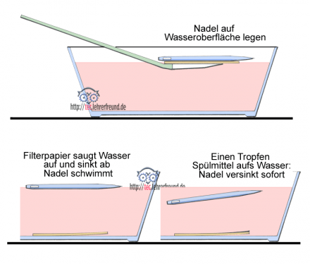 Ins Wasser gebrachte, massive Stahlteile sind etwa 8 Mal schwerer als Wasser und sinken deshalb. Durch das Auflegen auf poröses und absinkendes Papier kommen sie vorsichtig in Kontakt mit dem Wasser. Das Wasser besitzt tatsächlich eine Oberflächenspannung, die wie eine zähe Haut wirkt. Sie ist so tragfähig, dass das Metallteil darauf schwimmt.