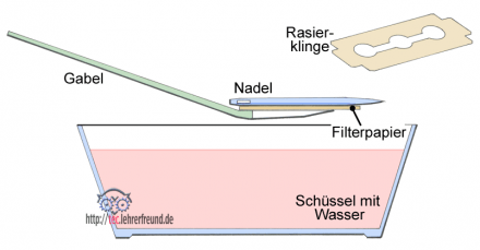 Man benötigt eine kleine Salatschüssel, die man ein paar Zentimeter hoch mit Wasser füllt. Aus einem Kaffe- oder Teefilterbeutel schneidet man sich einen Fleck heraus. Dann besorgt man möglichst flache Metallteile: Nähnadel, Rasierklinge, Knopf. Das Filterpapier legt man auf eine Gabel und eines der Metallteile darauf. So kann man das Metallteil feinfühlig auf der Wasseroberfläche platzieren. Zuletzt zieht man die Gabel vorsichtig nach unten weg.