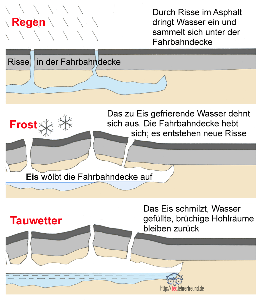 Das zu Eis gefrierende Wasser dehnt sich aus. Die Fahrbahndecke hebt sich - es entstehen neue Risse.