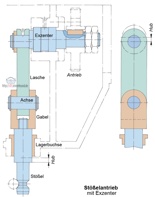 Der in einem Graugussgehäuse gelagerte Exzenter(welle) wird über Zahnräder angetrieben. Dabei macht die Lasche Schwingbewegungen, deren senkrechte Komponenten über eine Achse und eine Gabel auf den in einer Lagerbuchse laufenden Stößel übertragen werden. Auf den unteren Teil des Stößels wird ein (hier weggelassenes) Nietwerkzeug aufgesetzt.