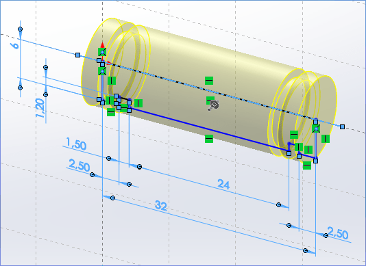 f) Beim Zeichnen der Skizze [2D-5R] haben wir keine Rücksicht auf die Bemaßung genommen. Das holen wir jetzt nach: Jede einzelne Linie anklicken und im Feld Linieneigenschaften unter Parameter [19R] das richtige Maß eintippen. So wird z. B. die linke Linie mit ihrer Länge von 39,5 mm überschrieben mit 6 mm, denn die fertige Achse hat einen ø von 12 mm. Dabei wird die erste Zeichnung zur schmalen Skizze [2D-6R] zusammengequetscht. Alle Längen und die Einstichdurchmesser sind dabei unmaßstäblich geblieben.