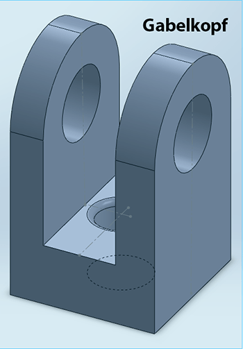 Der hier abgebildete Gabelkopf (Teil aus dem Stößelantrieb) ist ein Bauteil, bei dem das Arbeiten mit Referenzachsen bzw. -ebenen zum Tragen kommt.