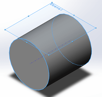 - Wir klicken in der Perspektive in den Zylinderumfang und im Ersten Auswahlfeld die Schaltfläche Tangential. Diese wird meistens automatisch berücksichtigt; dann erscheint sie nicht. Über der Welle erscheint eine blaue, durchsichtige Ebene [3E].