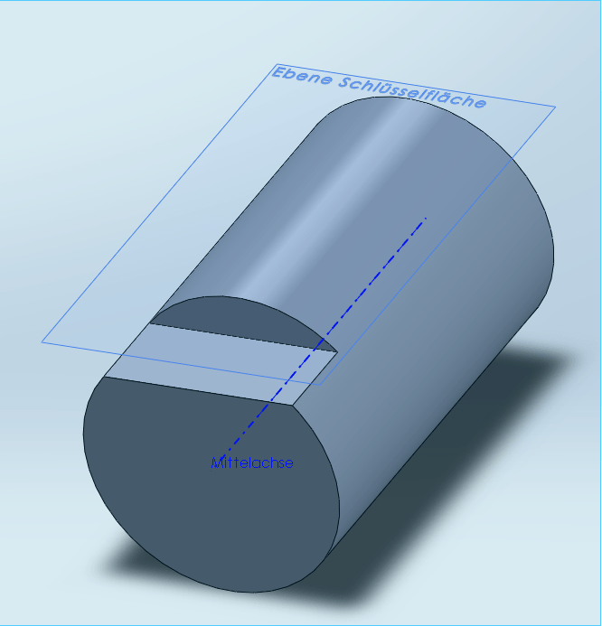 Schritte wie oben für die Passfedernut beschrieben. Anstelle der Linien für die Nute über der vorgesehenen Schlüsselfläche ein Ecken-Rechteck ziehen und mit Schnitt linear austragen über D1 die gewünschte Tiefe fräsen.