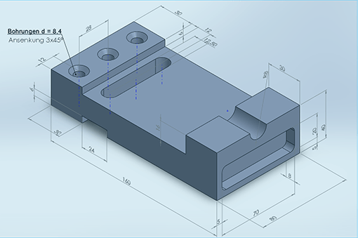 Um weitere Möglichkeiten und Funktionen in SolidWorks kennenzulernen, modellieren wir einen prismatischen Körper. Er ist 160 mm lang, 80 mm breit und 40 mm hoch (Bild Pr 1). Er soll verschiedene Aussparungen, drei Bohrungen und ein Langloch erhalten. Der Name des Teils: Lagerplatte.