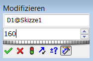 Alternative zum Eintrag über D1: Im Bemaßungsmodus öffnet ein Doppelklick auf die Maßzahl das Feld Modifizieren (Bild 1 Symb). Dort kann die gewünschte Maßzahl eingetragen und gleich bestätigt werden.