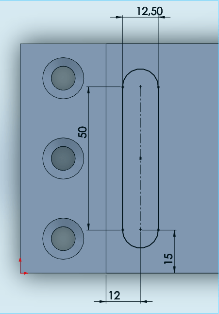 – Lagerbock in die Draufsicht drehen. Gerades Langloch Länge 50 mm, Breite 12,5 mm modellieren.