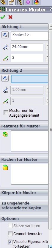 Um die drei Senkbohrungen zu erhalten, verwenden wir aus dem Propertymanager die Funktion Lineares Muster.