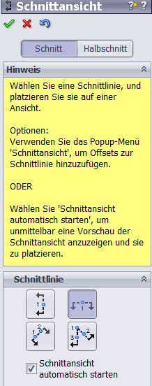 6. Draufsicht im Schnitt darstellen: Einfügen ––> Zeichenansicht ––> Schnitt (Bild La 2). Schnittangabe im PropertyManager notfalls umdrehen. Bisherige Draufsicht löschen (Rechtsklick).