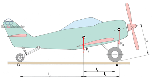 Ein Kleinflugzeug steht auf der Startbahn; dabei wird es durch sein Eigengewicht und das Motorgewicht belastet. Wir berechnen die Radaufstandskräfte und das aus der Vortriebskraft resultierende Kippmoment in der Startphase.