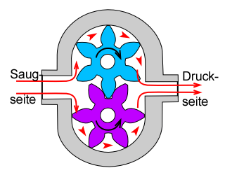 Das Bild zeigt die Funktion einer Zahnradpumpe. Beim Drehen der im Pumpengehäuse sauber eingepassten Zahnräder wird das Öl von der Saugseite in den Zahnlücken außen herum nach rechts auf die Druckseite gefördert.