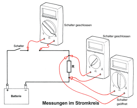 Strommessung: Die Stärke des elektrischen Stromes I wird mit dem Strommesser (Amperemeter) gemessen. Der Strom muss dabei das Messinstrument durchfließen; deshalb wird der Strommesser in den Stromkreis geschaltet.