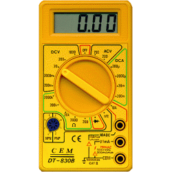 Multimessgeräte (hier Bild Thiecom) erlauben alle drei Messungen mit einem und demselben Gerät. Dabei müssen nur jeweils die Stromart und die Messgröße (Volt, Ampere, Ohm) vorgewählt werden.