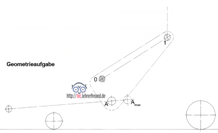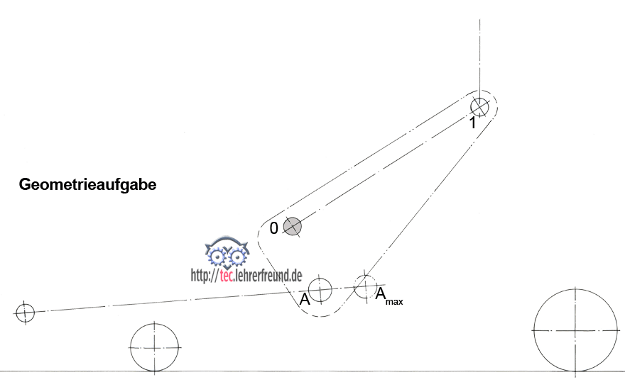 Geometrieaufgabe: Die Kolbenstange fährt bis Punkt Amax aus und schwenkt dabei den Hubarm nach oben.