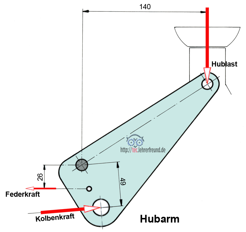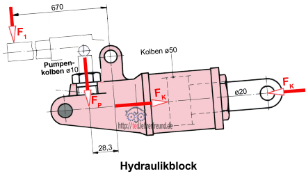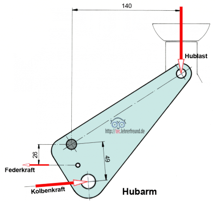 Was sie entkräftet, ist die Geometrie des Hubarms: Seine Druckrichtung weicht nur schwach von der Kolbenachse ab, d.h. auch die Biegekomponente ist nicht Besorgnis erregend. Trotzdem ist sie vorhanden. Eine zweite Kolbenstange (links vom Kolben) könnte diese Komponente aufnehmen. Ob diese Lösung im Wagenheber eingesetzt wird, können wir leider nicht mehr nachprüfen.
