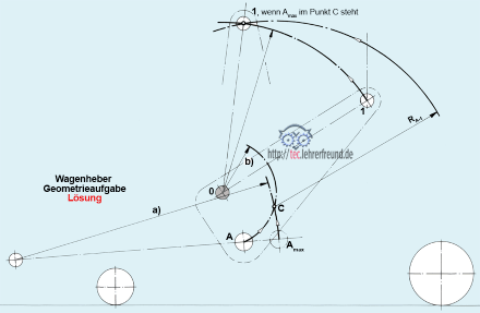 a) Zeichnen Sie den Kreis, auf dem sich Amax bei Betätigung des Hubarms bewegt.