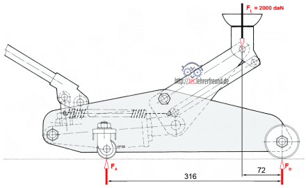 FL · (316 – 72) mm = FB · 316 mm –> FB = 2 000 daN · 244 mm : 316 mm =