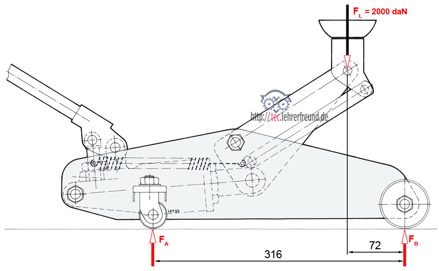 Der Wagenheber (siehe Drehmomente (1)) ist für eine Hublast bis 2 Tonnen (= 2 000 daN = 20 000 N) ausgelegt. In den Aufgaben gehen wir davon aus, dass diese Höchstlast auf den Sattel aufgesetzt ist. Drehpunkt des Hubarms ist die grau angelegte Achse.