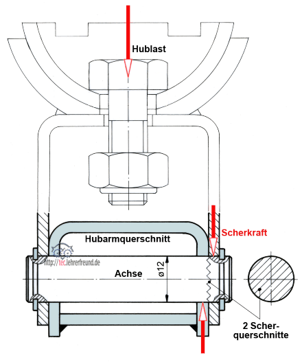 FL = 54 943 N = 5 494 daN ≙ 5 Tonnen. Abscherung ist demnach keine Gefahr für die Achse, weil sie nur mit max. 2 t beansprucht wird.