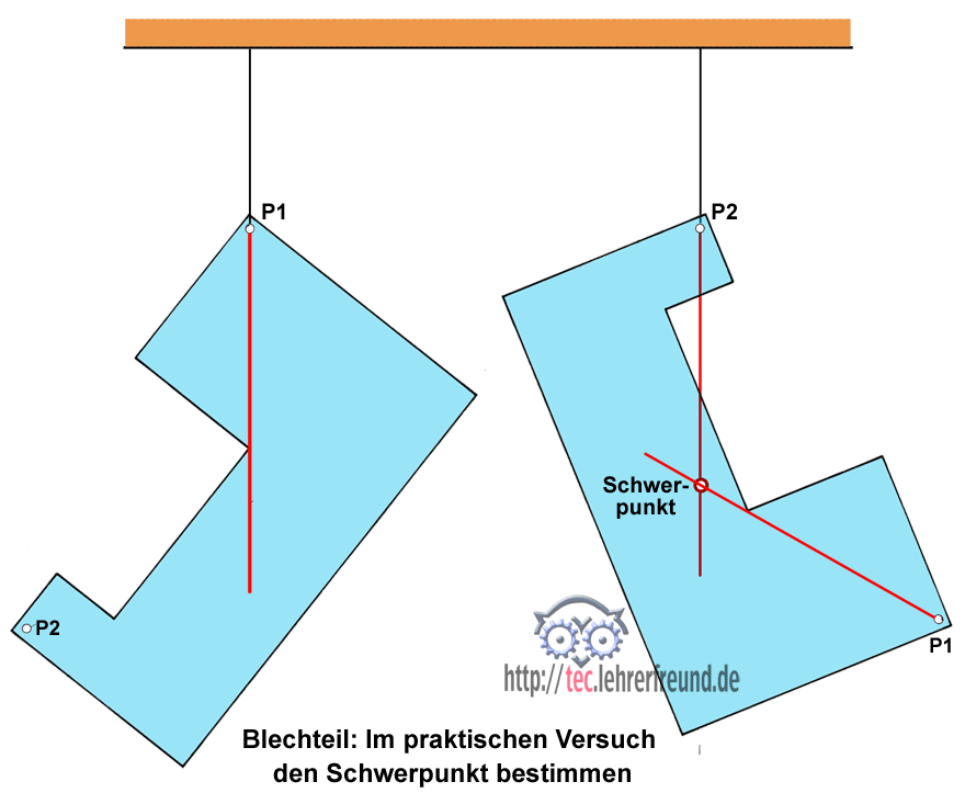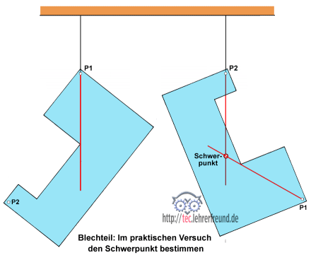Mit einem Versuch kann man den Schwerpunkt praktisch bestimmen: Man hängt das Blechteil an zwei beliebigen Punkten (hier P1 und P2) auf und verlängert jedesmal den senkrechten Faden (rote Linien) nach unten. Im Schnittpunkt der beiden Linien liegt der Schwerpunkt des Körpers (Skizze rechts). Die Rechenmethode sowie eine zeichnerische Konstruktion dazu werden weiter unten beschrieben.