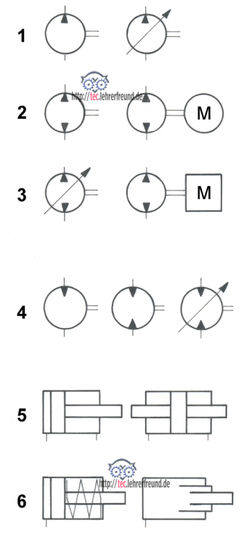 Gebräuchliche Konstruktionen sind: Zahnradpumpen, Axialkolbenpumpen, Radialkolbenpumpen, Flügelzellenpumpen. Unabhängig von der Pumpenkonstruktion ist ihr Symbol der Kreis mit nach außen zeigendem Pfeil. Zeigt der Pfeil nach innen (Bild 4), ist ein Hydromotor dargestellt.