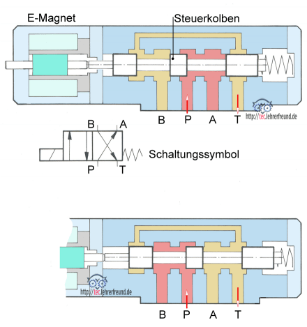 Direkt gesteuert werden kleinere Wegeventile, d. h. der Steuerkolben wird z. B. von Hand verschoben. Dazu sind am Wegeventil Betätigungselemente wie Druckknöpfe, Hebel, Pedale, Stößel usw. angebracht, über die der Steuerkolben unmittelbar betätigt wird. Das Bild zeigt ein (durch Elektromagnet) direkt gesteuertes 4/2-Wegeventil in beiden Schaltstellungen. Oben: Das Öl fließt von P nach A. Unten: Das Öl fließt von P nach B. Oft bedient man sich - wie hier - der elektrischen Variante, bei der der Kolben über Relaisspulen in seine Schaltstellungen gebracht wird. Alle erwähnten Betätigungsarten setzen relativ kleine Ölströme voraus.